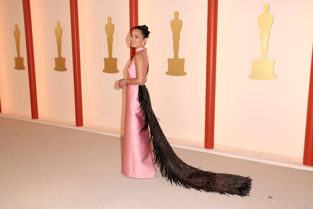 Calcando il tappeto con una raffinatezza che solo Prada può donare, l’attrice Hong Chau, nominata nella categoria Best Actress in a Supporting Role per The Whale, ha indossato un abito in raso tec rosa con ampio strascico, impreziosito da un ricamo all-over di frange e paillettes nere.