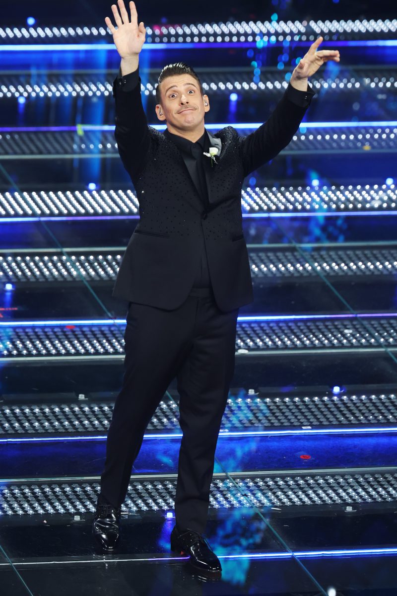 Tony Effe, irriconoscibile senza tatuaggi, in un completo bianco, guanti burgundy (o meglio Gucci Ancora) e una spilla oro Tiffany&Co. Una piacevole sorpresa. Voto 8.