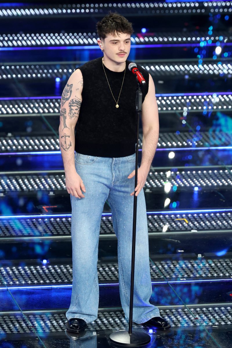 Rkomi sacrifica lo stile per dieci punti del Fansanremo con il suo look firmato Vivienne Westwood. Voto 5.