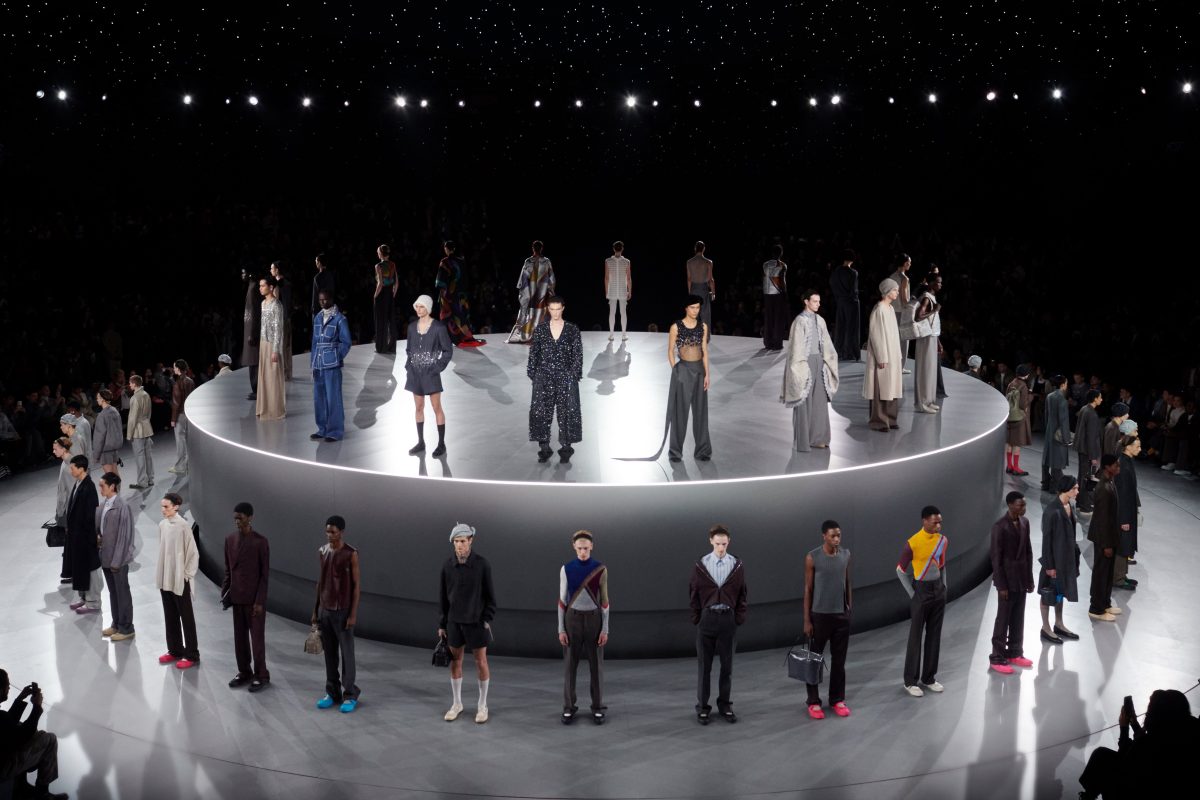 In passerella si susseguono abiti tailoring sofisticati e fluidi a outfit dall’eleganza urbana formati da capi iconici del guardaroba maschile contaminati dallo sportswear, la cifra stilistica tipica del direttore creativo. Linee essenziali personalizzate dalla scelta dei rever, delle pence e dei volumi, vengono interpretate in una scala di colori neutri, in primis il grigio caldo di Dior. Tanta maglieria, anche per gli short che si combinano a canotte e giacconi outdoor.