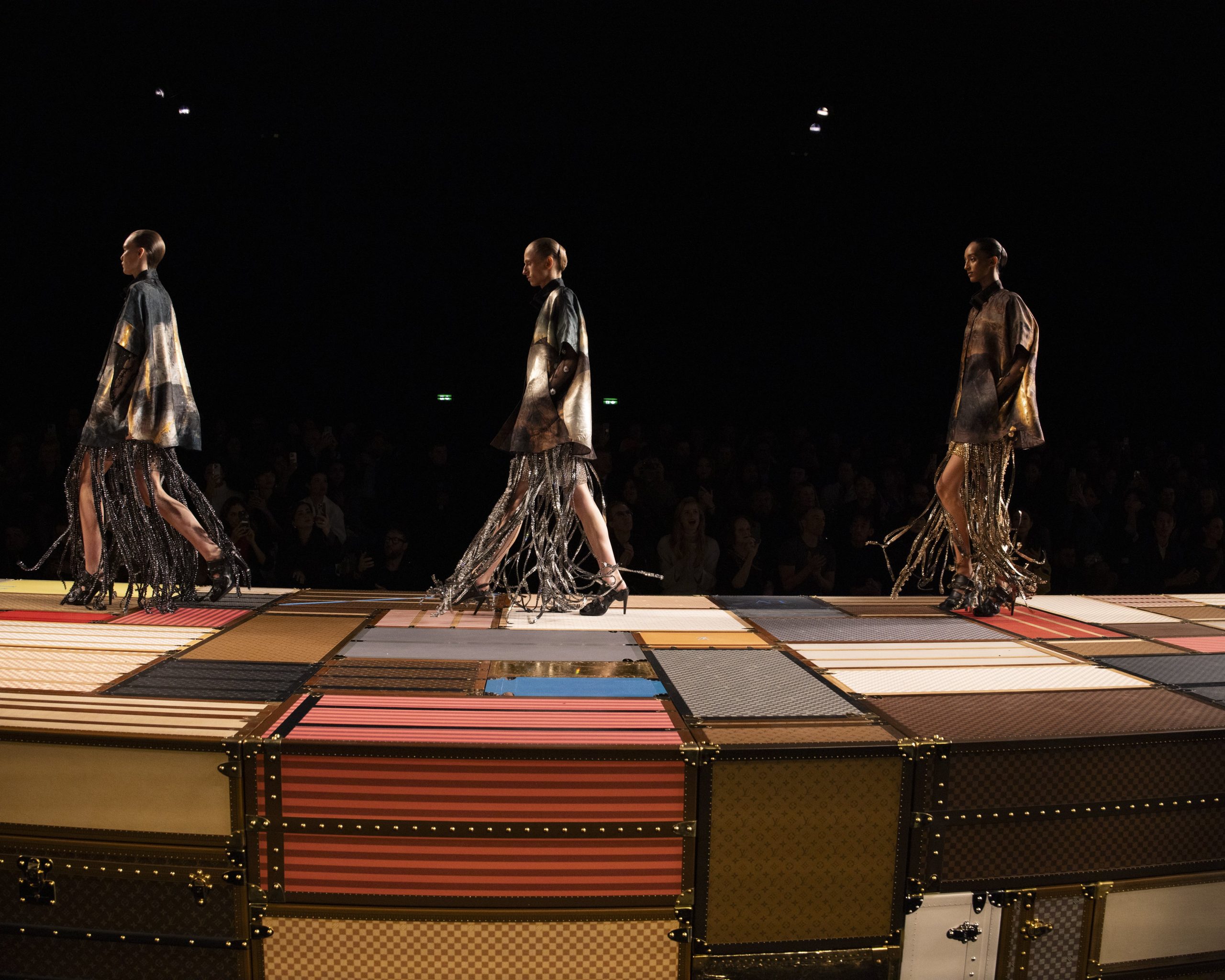 Anche le stampe — alcune riprese dalle opere di Laurent Grasso — aiutano a rimarcare il contrasto tra delicatezza e potere, in un’esplosione di colori che tinge giacche e abiti dai tessuti impalpabili. Quello di Ghesquière è un approccio giocoso alla moda che però non prescinde dal lusso e dall’opulenza tipica di maison Louis Vuitton. Dopotutto non esisterebbe «soft power» senza un pizzico di marcata ostentazione.