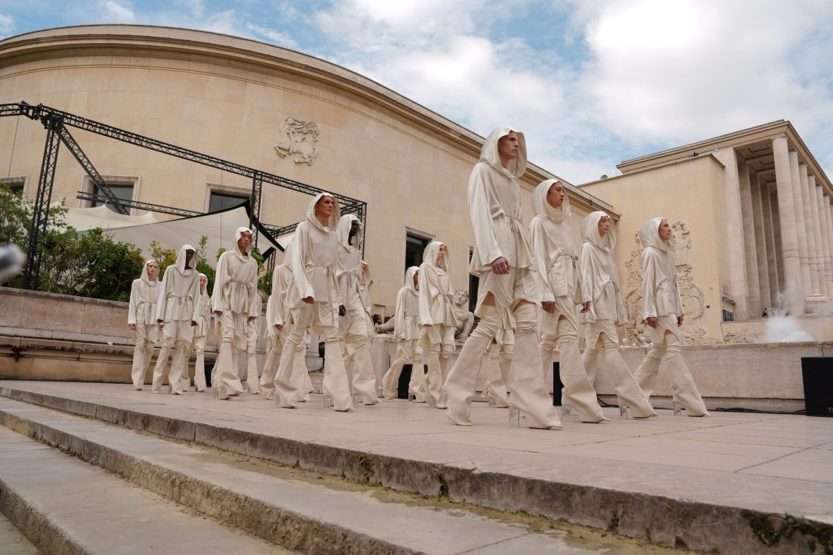 Non si parla più di classiche sfilate, ma di un’armata di modelli, studenti di scuole di moda e artisti circensi che sfilano nell’imponente spianata del Palais de Tokyo. Per un totale di 200 look total white, questa volta Rick Owens omaggia sé stesso e tutti i pezzi cult che l’hanno portato sui gradini più alti della moda. A sfilare volti mascherati, lunghi mantelli e le tipiche calzature torreggianti in casa Owens.
