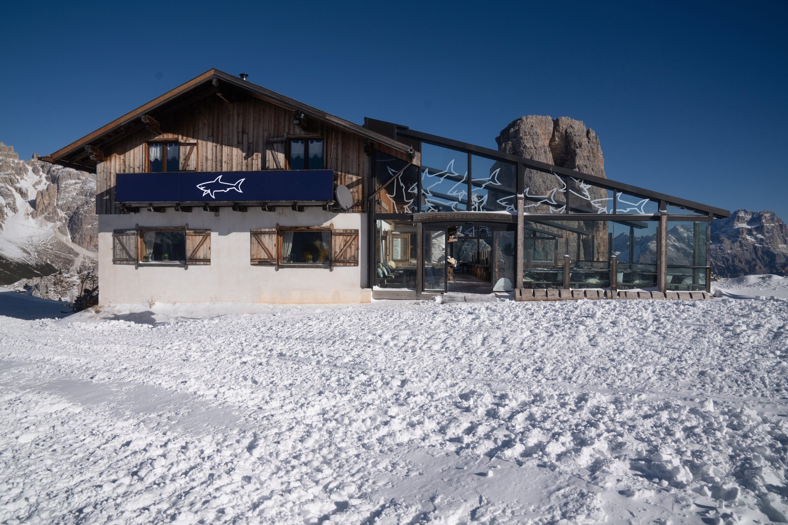 Il cuore del progetto «Paul & Shark takes Cortina» è rappresentato dallo chalet Scoiattoli, un rifugio storico caratterizzato da travi a vista, tavoli in legno e una terrazza panoramica che si affaccia sulle iconiche cime delle Cinque Torri. L’atmosfera accogliente ed elegante di questo luogo offre una pausa dal freddo pungente, immersa nell’universo Paul & Shark. Ogni dettaglio della mise en place è curato dal brand, con tovagliette, sottobicchieri, e tovaglioli caratterizzati dalla presenza degli squali bianchi e oro, insieme all’iconico blu che li rende inconfondibili. Persino un’installazione suggestiva, a forma di maschera da sci blu con squali bianchi Paul & Shark, è posizionata sulla terrazza panoramica dello chalet, offrendo una vista spettacolare del tramonto sulle Dolomiti, accanto al bar, elegantemente ricoperto da un effetto ghiaccio. Lo chalet Scoiattoli si trasforma così in una dimora invernale firmata Paul & Shark, dove gli ospiti possono immergersi nell’eleganza outdoor del brand. Durante la serata di inaugurazione, l’iconico squalo raggiungerà persino la vetta delle Cinque Torri attraverso un’esclusiva proiezione visibile dal dehor del rifugio.