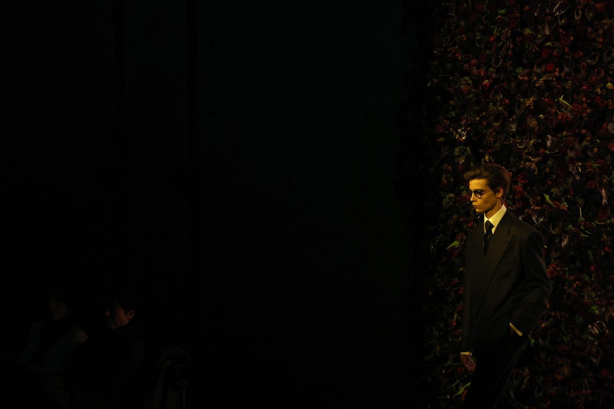La classica silhouette a doppio petto funge da tela per la sua visione artistica, fondendo senza soluzione di continuità la sartoria tradizionale, che fa eco agli anni Ottanta, con la sensibilità contemporanea. Tuttavia, nel corso della sfilata, la rigida formalità dell’abito tradizionale lascia il posto a una fluidità di movimento, che simboleggia il passaggio a un’espressione più libera di sé, figlia dei tempi e — in qualche modo — rappresentata dalla stessa front row che vede attori e musicisti asiatici (Jeonghan dei Seventeen, Mark Tuan, Kento Yamazaki, Ten degli NCT) pionieri nel concetto di mascolinità soft.