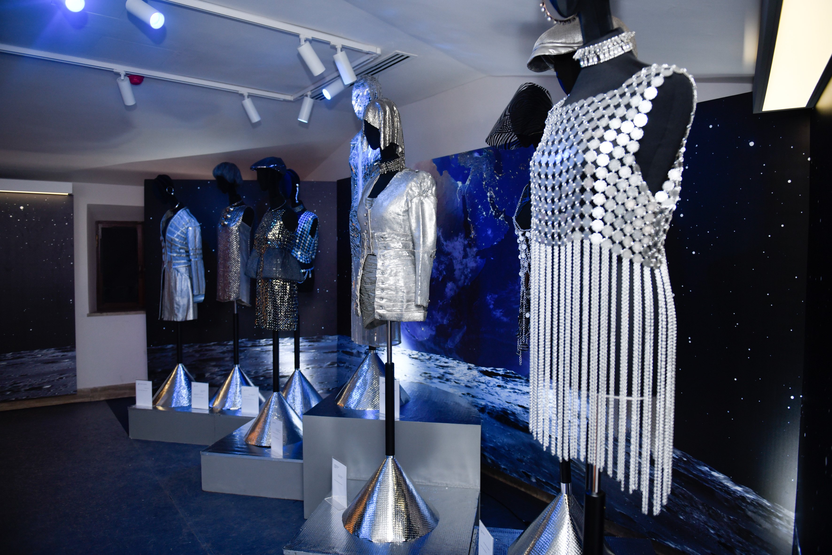 La mostra si divide in cinque sale dove ognuna racconta un aspetto di quegli anni: la prima sala è dedicata a Carnaby Street, dove tutto prende inizio. La seconda sala invece vede protagoniste le colorate piume di Ken Scott e i dolci angioletti di Fiorucci. Il terzo capitolo omaggia la space age, dove Paco Rabanne e Pierre Cardin hanno riprodotto atmosfere spaziali con i loro abiti in pvc.