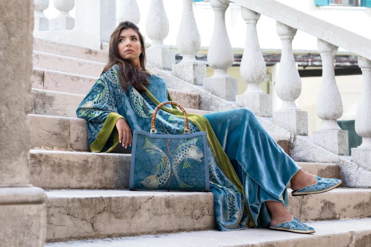 Preziosi velluti stampati con note floreali e originali motivi «in azur» ispirati alle trame naturali della Laguna veneziana hanno portato a conclusione la Venice Fashion Week.