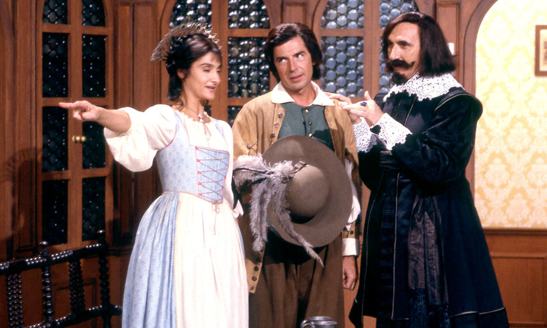 Lo sceneggiato tv “I promessi sposi”: il romanzo di Manzoni è re-interpretato dal trio Solenghi, Marchesini e Lopez, 1990. Nella foto Anna Marchesini (nei panni di Lucia), Tullio Solenghi (Renzo) e Pippo Baudo (nei panni del padre di Lucia).