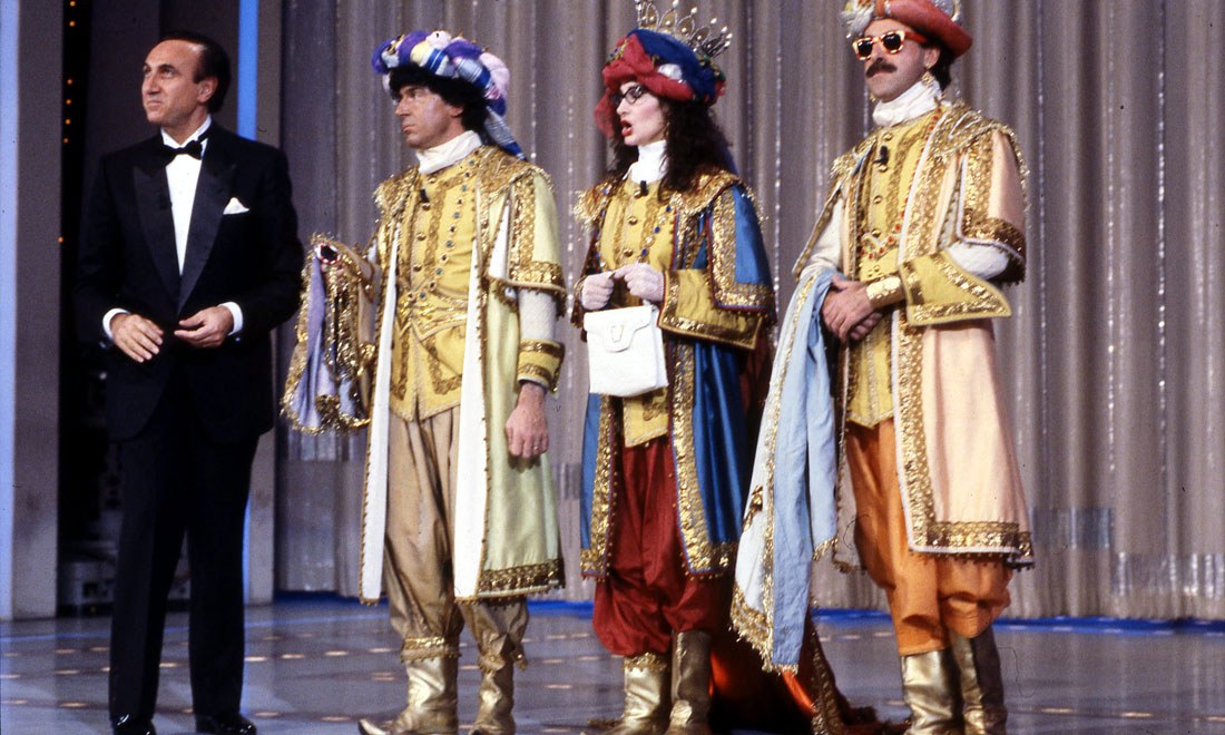 Pippo Baudo e il trio Tullio Solenghi, Anna Marchesini e Massimo Lopez nella trasmissione “Fantastico”, 1987.