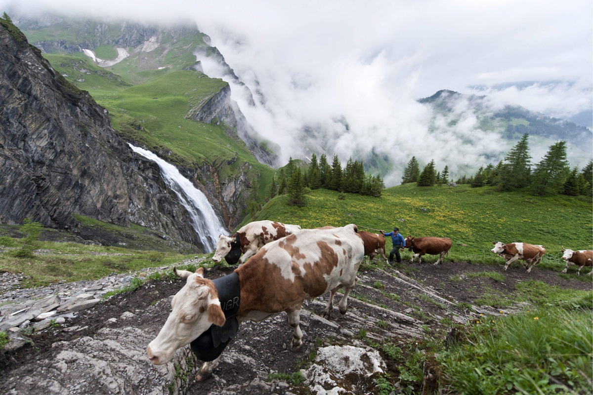 Il fotografo Alessandro Della Valle ha seguito la trasferta di una mandria di circa 400 mucche che da Adelboden, nel Canton Berna svizzero, vengono condotte da esperti mandriani verso l’alpe di Engstligen, dove trascorreranno il loro periodo estivo di 70 giorni. Dopo il lungo inverno trascorso a fondovalle, con l’arrivo della stagione calda i bovini vengono condotti in quota, presso gli alpeggi, lontano dal caldo, dove possono trascorrere l’intera giornata all’aria aperta, cibandosi di erba fresca. Eccole salire lungo lo stretto sentiero di montagna che le condurrà a circa 2.000 metri di altitudine: 600 metri di dislivello percorsi dalle mucche in poco più di un’ora.