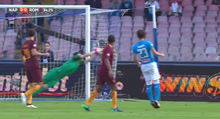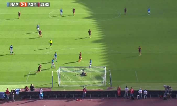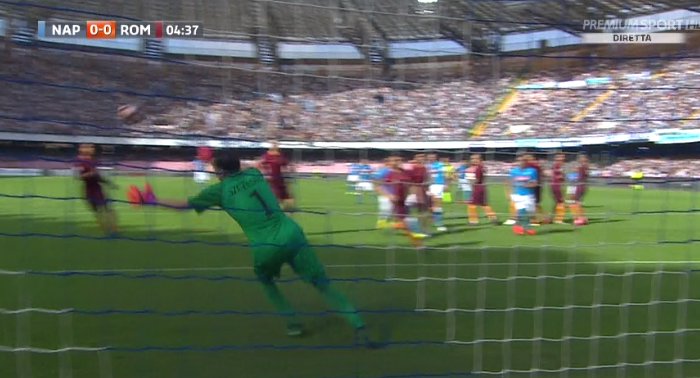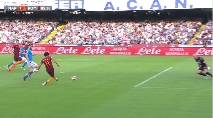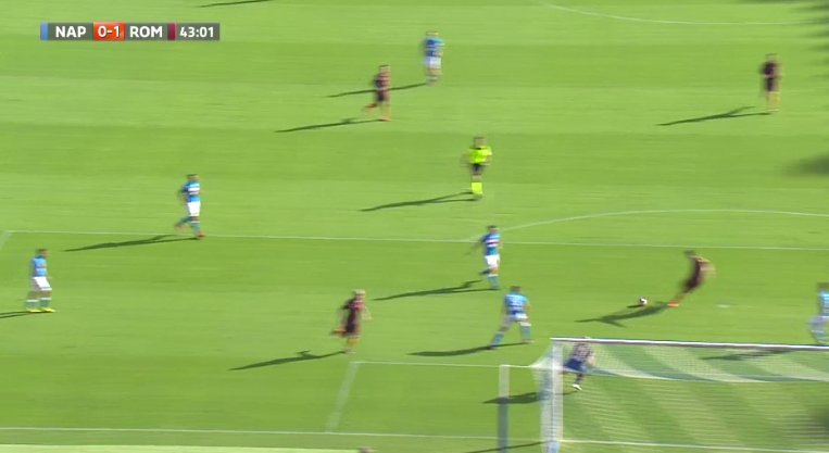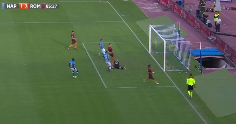 32′ – Assist di Salah per Dzeko, che scatta in posizione regolare (tenuto in gioco dalla linea difensiva del Napoli) ma non arriva sul pallone prima di Reina che si tuffa in uscita bassa. Poi il piede di richiamo di Dzeko tocca il volto del portiere che resta a terra: fallo, ma niente ammonizione