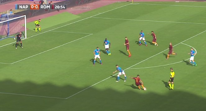 15′ – Verticalizzazione di Nainggolan per Dzeko che scatta in posizione regolare, ma al momento di concludere a tu per tu con Reina viene rimontato da Koulibaly che mette in angolo senza commettere fallo. Recupero straordinario del difensore