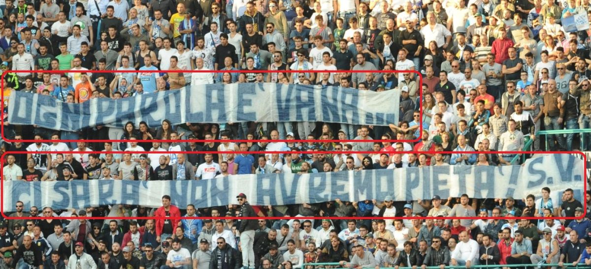 All’andata succede tutti in pochi istanti in un pomeriggio in cui un intero stadio celebra una sorta di funerale laico del compagno di curva caduto. In curva B appare uno striscione di una trentina di metri. Giura vendetta: “Ogni parole è vana. Se occasione ci sarà, non avremo pietà…”. Qualche istante prima la Curva A aveva esposto un non meno minaccioso “3-5-2014, ai posteri l’ardua sentenza”.