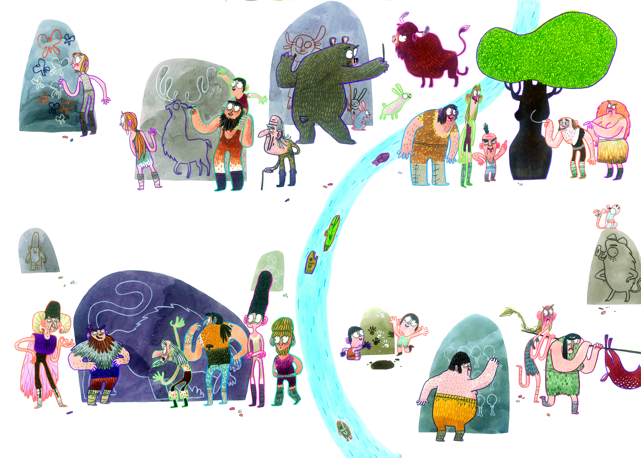 Pietr Van Oudheusden in Caccia alla tigre dai denti a sciabola, edito da Sinnos, immagina come gli uomini delle tribù primitive siano arrivati a tracciare i primi disegni sulle rocce e lo racconta in una storia avventurosa e dolce allo stesso tempo. Le illustrazioni spiritose e coloratissime sono di Benjamin Leroy.