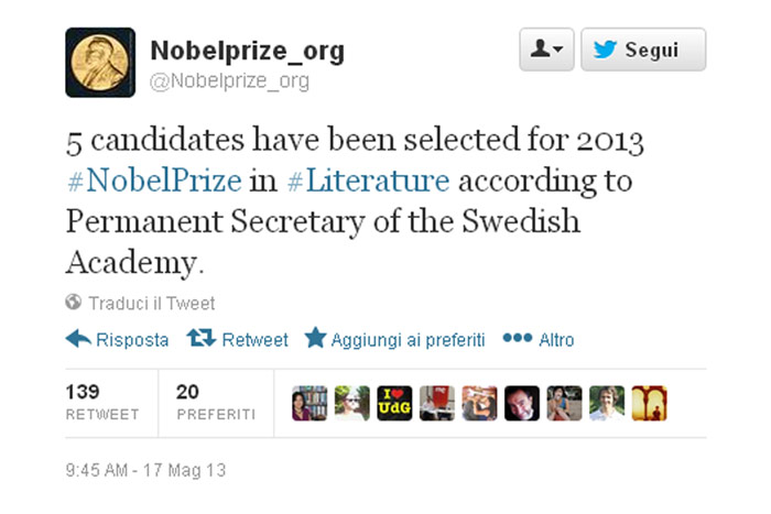 L’Accademia Svedese ha lanciato pochi giorni fa un enigmatico tweet , secondo il quale sembra siano stati selezionati i cinque candidati al Premio Nobel 2013 per la Letteratura.