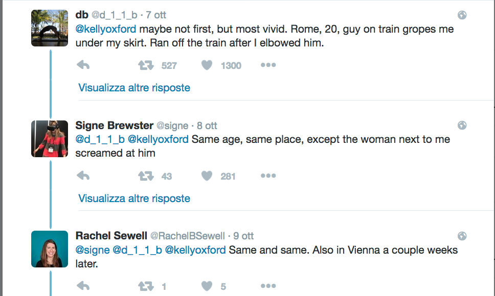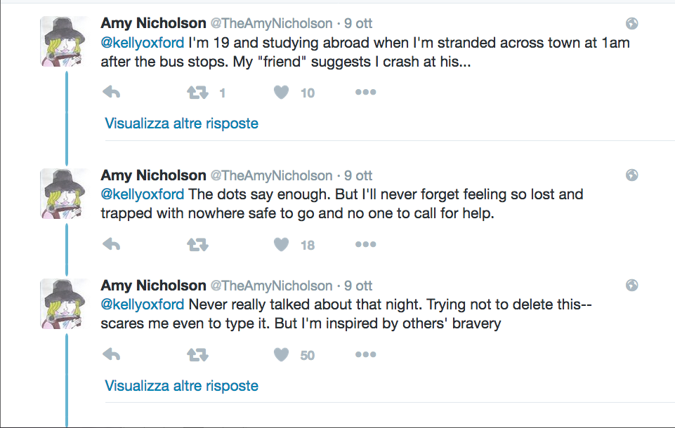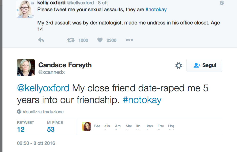 Un fiume ininterrotto di tweet dal minimo comun denominatore: lo stupro. “Un ragazzo di 18 anni mi ha sollevato la maglia e toccato il seno, io ne avevo 12”; “Avevo 11 anni e mio cugino si è infilato nel mio letto e mi ha chiesto di toccarlo, altrimenti avrebbe parlato male di me al ragazzo di cui mi ero innamorata”; “Essere chiamata puttana quando ho chiesto a un uomo di smettere di guardarmi il seno”; “Quando avevo 18 anni pensavo fosse normale, facendo la cameriera, che gli uomini mi dessero delle pacche sul sedere e facessero commenti sul mio seno”.