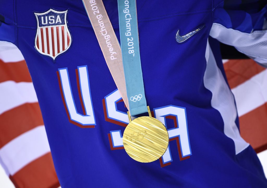Un dettaglio della medaglia d’oro sul collo di un giocatore della squadra Usa di hockey – 22 febbraio 2018