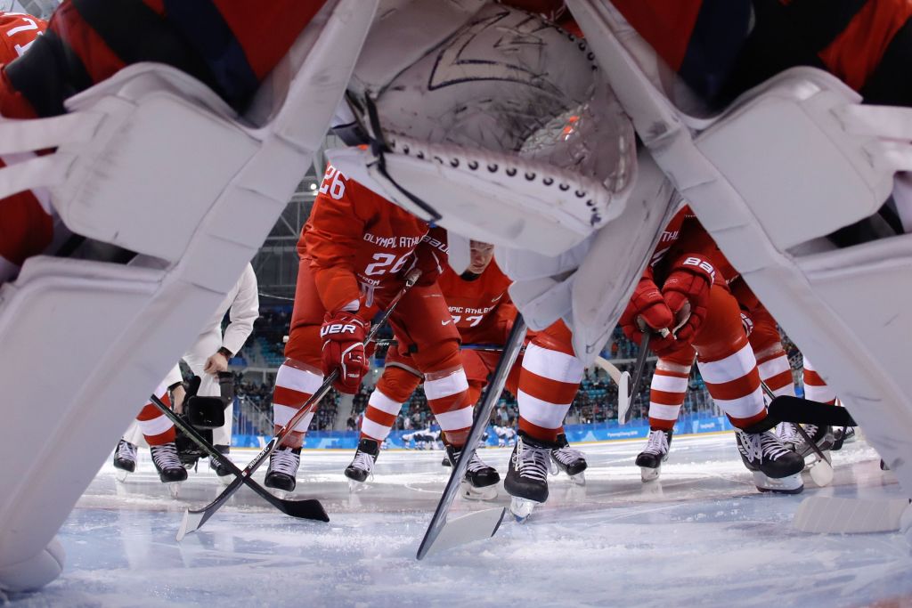 Un momento della sfida di hockey su ghiaccio tra Russia e Slovenia – 16 febbraio 2018