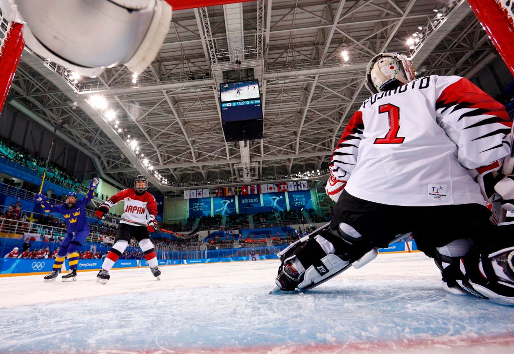 Fanny Rask festeggia il gol nel turno preliminare dopo l’incontro di hockey femminile tra Giappone e Svezia – 10 febbraio 2018