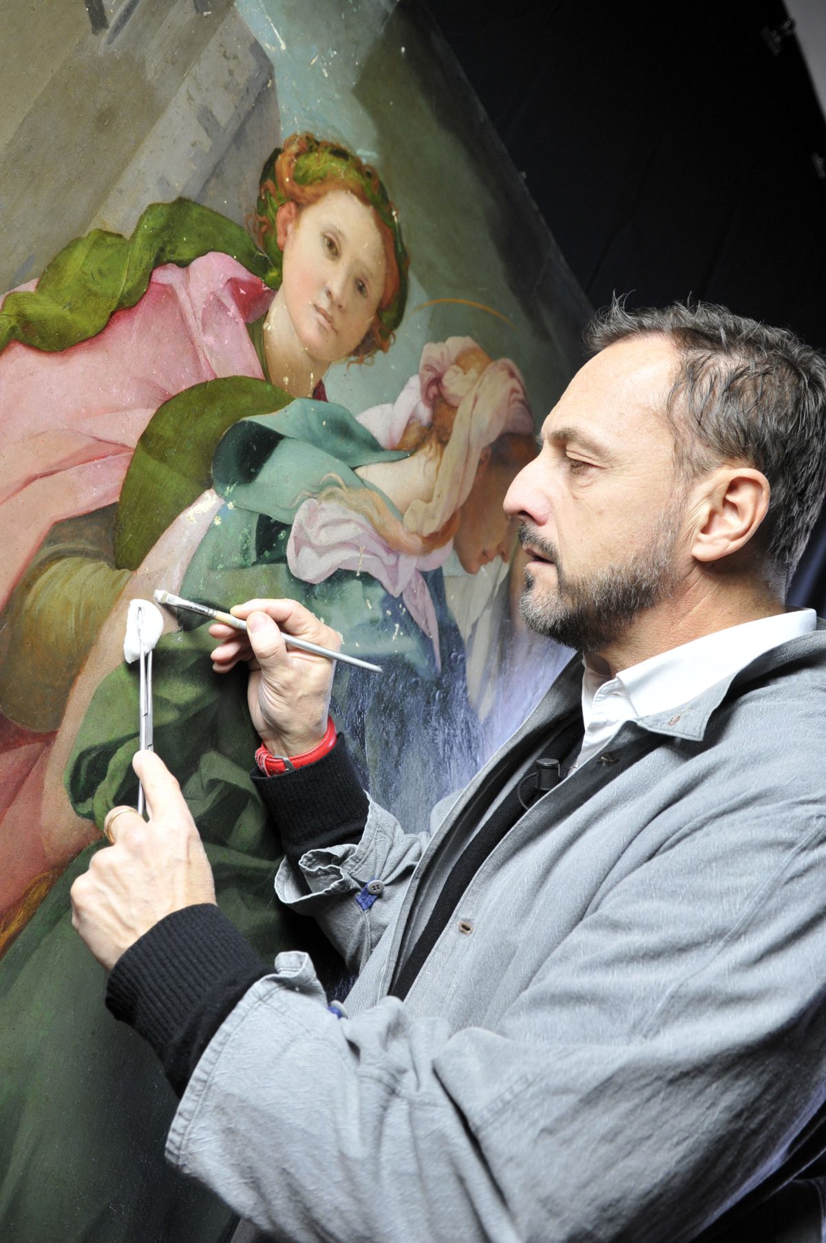 Adesso toccherà alle due misteriose don ne frontali. Poi sarà la volta della Madonna e di Elisabetta, sui cui abiti, come gonfiati dal vento, «esplodono raffinatissimi quei colori interposti al verde: l’ocra gialla, la biacca, il giallo di stagno e piombo, e poi la sfiammatura che si fa col cinabro». Rossi potrebbe andare avanti per ore a raccontare dei colori del Pontormo, di come dovessero apparire ai suoi contemporanei. Ma sa anche che la formula del “riportare all’antico splendore” è «una sciocchezza». Sa che un restauro è sempre un arbitrio e che la sfida è sapersi fermare nel giusto punto di equilibrio, «un compromesso che deve tendere all’originale sapendo che questo, nella sua esattezza, lo potremo solo immaginare».