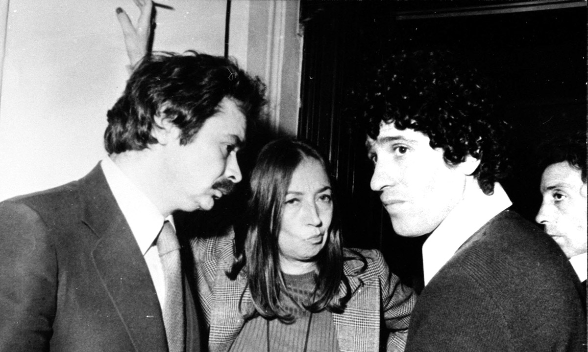Oriana Fallaci con il suo compagno dell’epoca, il rivoluzionario e poeta greco Alexander Panagoulis, e con Ninetto Davoli, attore-feticcio di Pasolini.