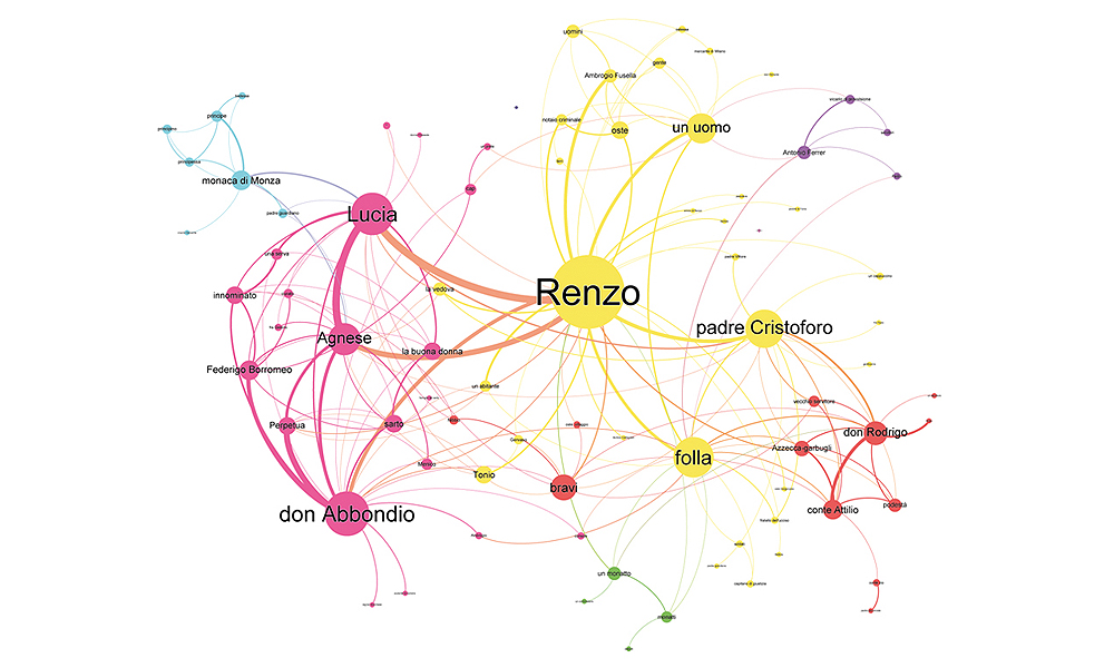 Tra i risulati dell’elaborazione, la mappa di relazioni che vedete nel grafico qui sopra, una sorta di rete sociale con al centro Renzo.