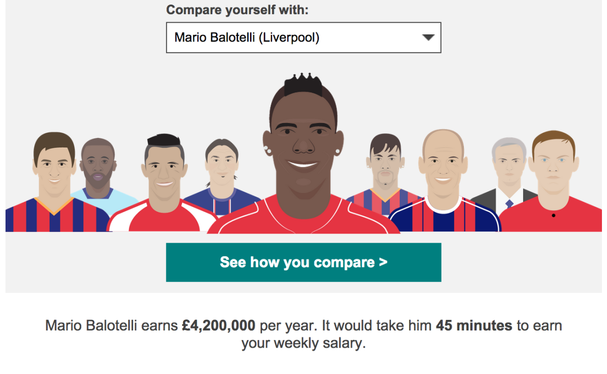 Il calcolatore (che potete trovare qui) funziona in modo molto semplice: si inserisce il proprio salario annuale, nella valuta selezionata in funzione della nazione di appartenenza. Quindi si sceglie il calciatore con il quale si vuole eseguire il confronto. Tra i vari personaggi disponibili per la comparazione ci sono Lionel Messi e Cristiano Ronaldo, i due giocatori più pagati al mondo, ma anche Zlatan Ibrahimovic, Gareth Bale, Gianluigi Buffon (unico rappresentante della Serie A italiana) e l’allenatore del Bayern Monaco Pep Guardiola. Tra i calciatori militanti in Premier spicca invece, almeno per noi italiani, il nome di Mario Balotelli che in effetti con i suoi 6 milioni di euro annui puà vantare uno stipendio di tutto rispetto.