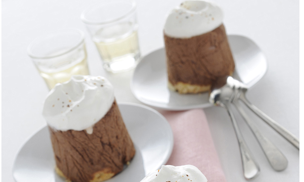 3 Taglia i biscotti. Dividi i savoiardi in pezzi a misura del diametro degli stampini, appoggiali sulla mousse e coprili con la pellicola che fuoriesce. Metti gli stampini in freezer per 6 ore; sformali aiutandoti con la pellicola. Servili con la panna montata rimasta e spolverizzati con cacao.