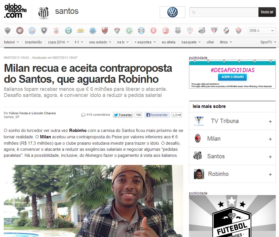 Globo Esporte ha rilanciato: “Il Milan ha accettato l’offerta per Robinho”. L’attaccante brasiliano, voglioso di tornare in patria nell’anno che introduce al mondiale, sembra sempre più vicino al Santos. Dopo la richiesta di Adriano Galliani di circa 8 milioni dilazionati in pagamenti rateali il rilancio di 6 milioni cash ha sbloccato l’operazione. Grande ostacolo restano però le tempistiche: il calciomercato brasiliano scade il 15 luglio anche se si ventila una possibile proroga di una settimana. Dalla trattativa per Robinho dipende anche il futuro di Ljajic, il Milan ha già l’accordo con il giocatore e la liquidità per il brasiliano passerebbe subito ai Della Valle.
