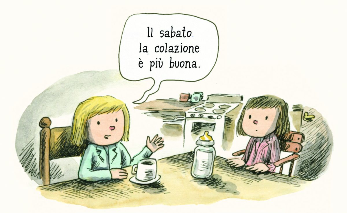 Un libro che racconta in un albo a fumetti la storia di due sorelline alle prese con una meravigliosa giornata di pioggia, resa speciale dal fatto che è sabato e il sabato si vede tutto con una luce diversa.