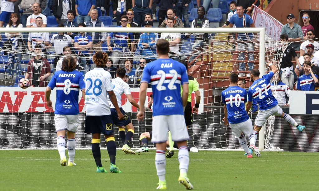 La Sampdoria pareggia 1-1 contro il Chievo Verona nella 36a giornata di Serie A. Blucerchiati in vantaggio dopo 11 minuti con il decimo gol stagionale di Fabio Quagliarella ma raggiunti al 46′ da Inglese.
