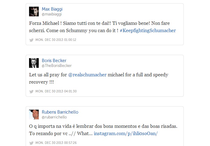Il mondo dello sport vive con il fiato sospeso il dramma di Michael Schumacher. L’ex pilota di Formula 1, 7 volte campione del mondo, è ancora in coma dopo l’incidente accaduto mentre sciava a Maribel insieme al figlio di 14 anni. Trasportato all’ospedale di Grenoble è stato operato per due volte al cervello nel tentativo di ridurre il profondo trauma cranico dopo lo schianto su una roccia. Su Twitter i principali protagonisti della Formula 1 e dello sport in generale si sono stretti intorno al campione, una cascata di preghiere e tributi per dare forza all’ex ferrarista.