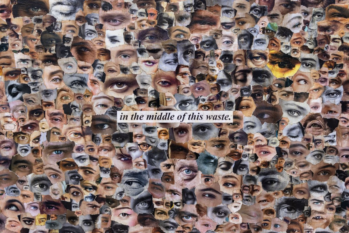 Sono partita come sempre dai rifiuti creando la base, la più grande realizzata fino ad adesso con una dimensione di 1 m x 1 m. Per la parte decorativa ho utilizzato invece più di 1100 strappi di occhi presi da vecchie riviste, volevo trasmettere il messaggio che siamo tutti collegati, anche a milioni di chilometri di distanza e che ogni cosa accade in mezzo ai rifiuti. È stata una lavorazione che in tutto ha richiesto circa 3 settimane, per costruire il tessuto visivo in modo uniforme.