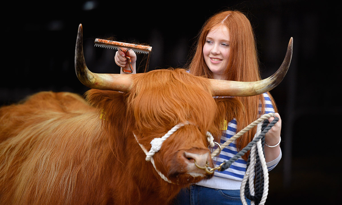 22 giugno 2016. Laura Hunter, 17 anni, in posa con un esemplare di vacca delle Highlander di nome Molly al 176° “Royal Highland show” di Ingliston, Edinburgo, Scozia, una delle più celebri fiere nel Paese dedicate all’agricoltura e all’allevamento.