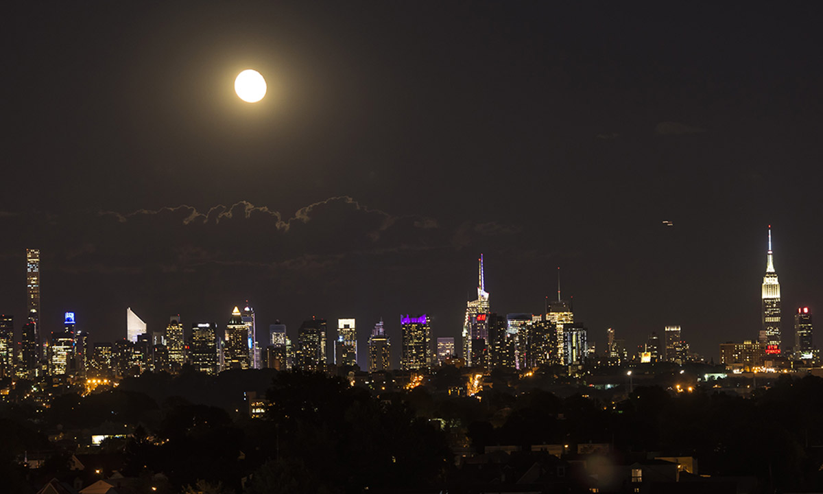 22 giugno 2016. La Luna sorge sullo skyline di Manhattan a New York.