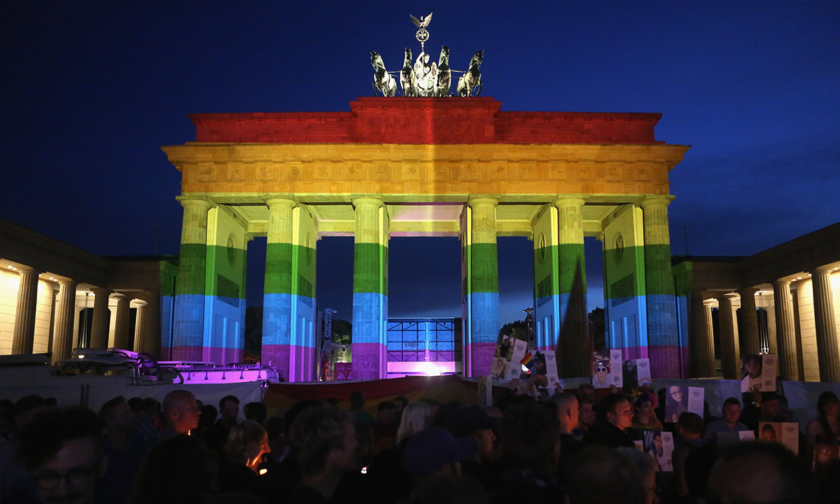 18 giugno 2016. La Porta di Brandeburgo a Berlino illuminata dai colori della bandiera arcobaleno, simbolo del movimento LGBT, in omaggio alle vittime della strage di Orlando, in Florida