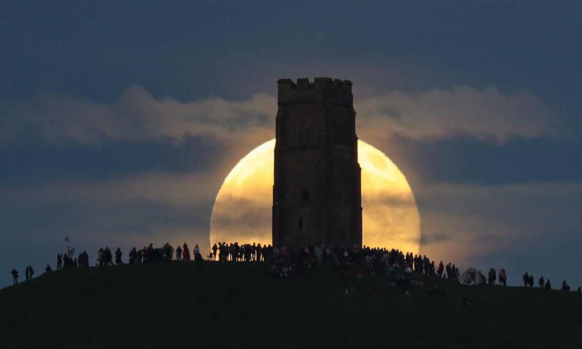 20 giugno 2016. La luna piena sorge dietro la torre di Glastonbury, nel Somerset, in Inghilterra, dove un gruppo di persone festeggia il solstizio d’estate. La coincidenza tra Luna Piena e solstizio d’estate si ripeterà solamente nel 2062.