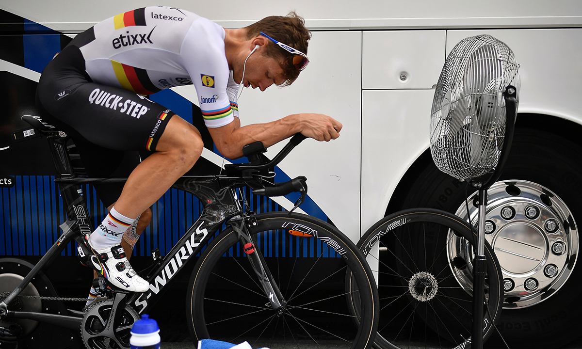 21 luglio 2016. Il ciclista tedesco Tony Martin in riscaldamento di fronte a un ventilatore, prima della 18esima tappa del Tour de France, 103esima edizione: una individuale di 17 km tra Sallanches e Megeve, sulle Alpi.
