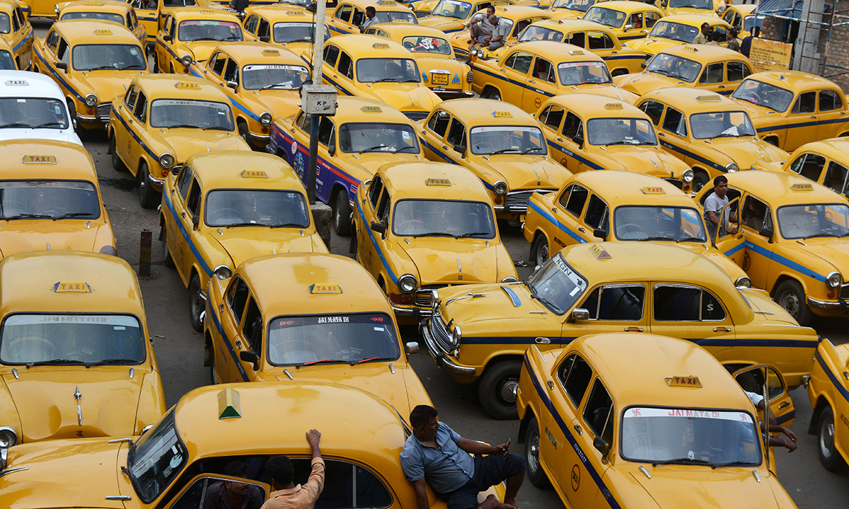 2 settembre 2016. Tassisti in attesa di passeggeri fuori da una stazione ferroviaria di Calcutta, in India, durante uno sciopero dei trasporti convocato dai 10 più grandi sindacati per chiedere aumento di salari e riforme economiche con la partecipazioni. Milioni di lavoratori del settore pubblico hanno manifestato contro il governo del Primo Ministro, Narendra Modi.