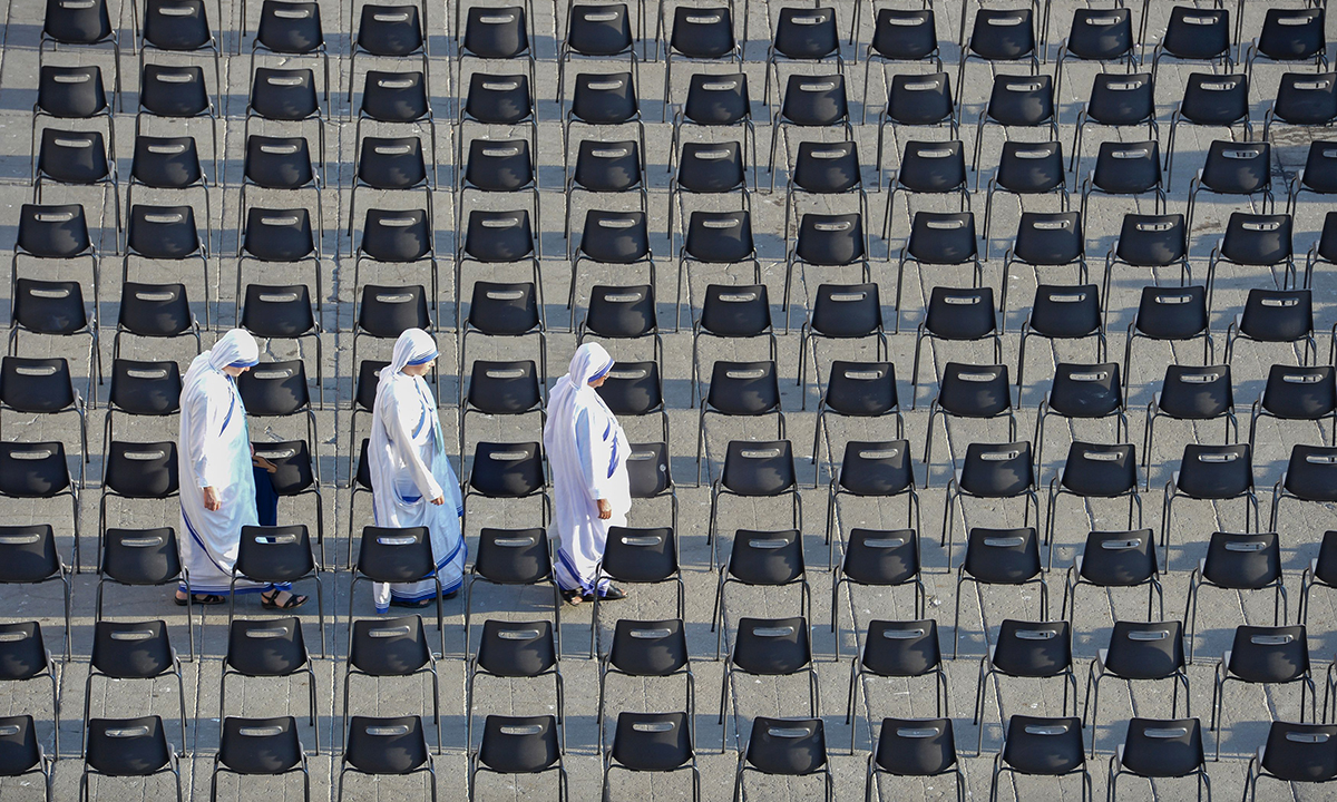 4 settembre 2016 Tre Sorelle della carità camminano tra le sedie ancora vuote, prima della cerimonia di canonizzazione di madre Teresa di Calcutta, in Piazza San Pietro, città del Vaticano.