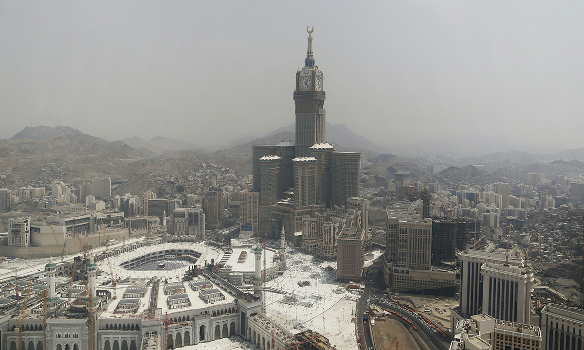 6 settembre 2016. Una veduta aerea della Torre dell’Orologio e della Grande Moschea alla Mecca, la città santa musulmana in Arabia Saudita, dove fedeli di tutto il mondo si sono riuniti per l’annuale pellegrinaggio “Hajj”, uno dei pilastro dell’Islam