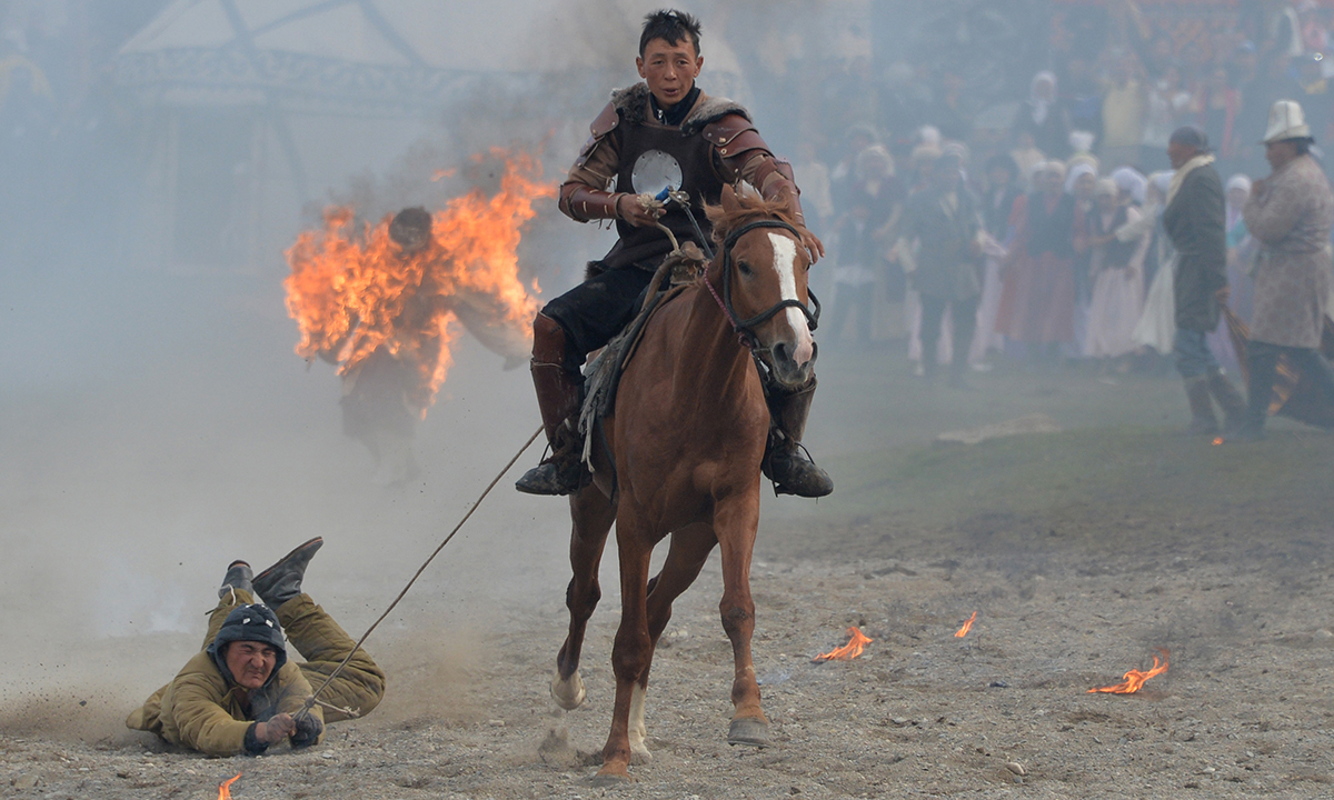 4 settembre 2016. Presso il villaggio di Kyrchin, nella regione di Osh in Kirgihzistan. a circa 300 km dalla capitale Bishkek, due stuntmen si esibiscono durante i Giochi mondiali dei nomadi.