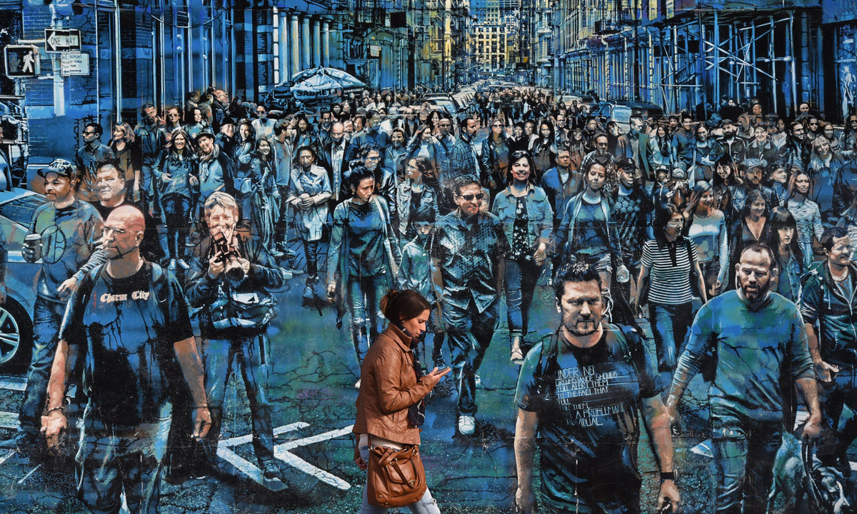 24 ottobre 2016. Una donna cammina lungo un murale dell’artista Logan Hicks intitolato “The Story of My Life” realizzato sul celebre “muro d’arte” all’incrocio tra la Houston Street e la Bowery Street di New York, USA.