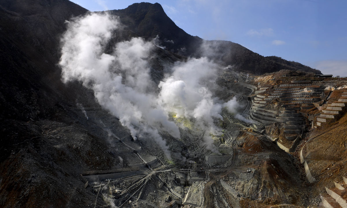 24 ottobre 2016. Una veduta dall’alto della valle di Owakudani (grande vallata bollente), una zona vulcanica situata a Hakone, nella prefettura di Kanagawa, in Giappone, a circa 100 km da Tokyo.