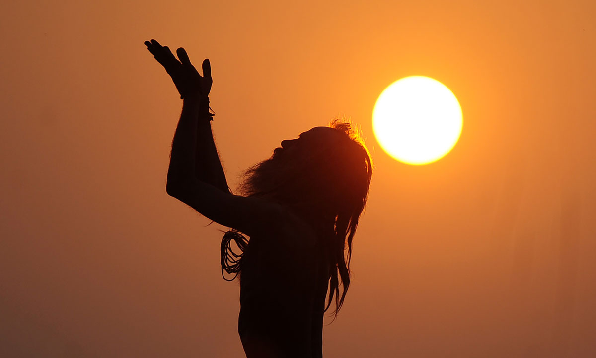 27 ottobre 2016. Un sadhu indù pratica lo yoga al tramonto sulla scalinata Dashashwamedh Ghat che a Varanasi, in India, conduce al fiume Gange.