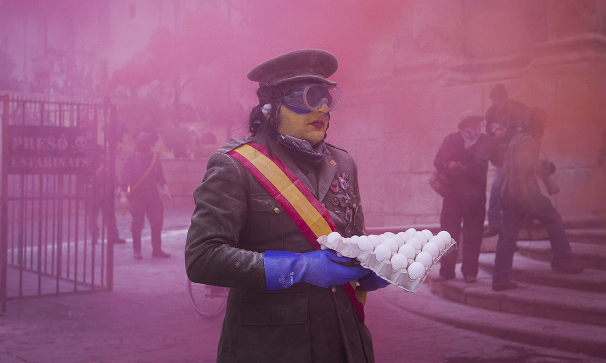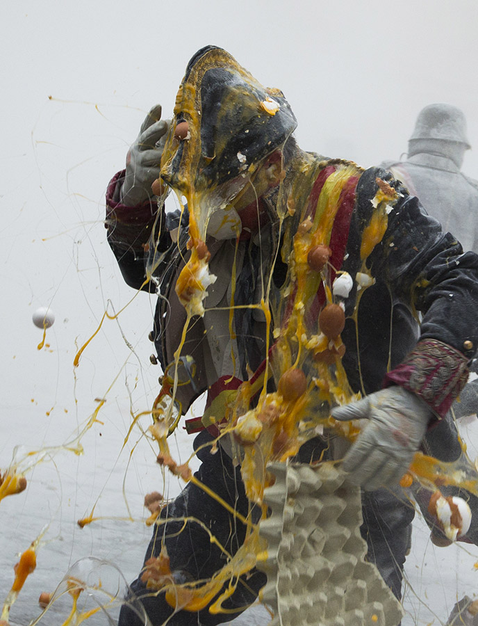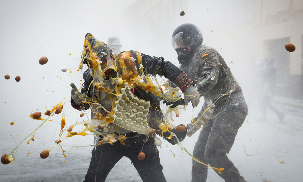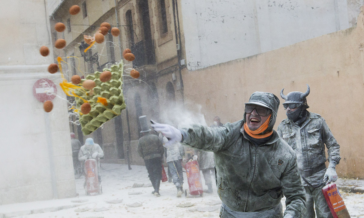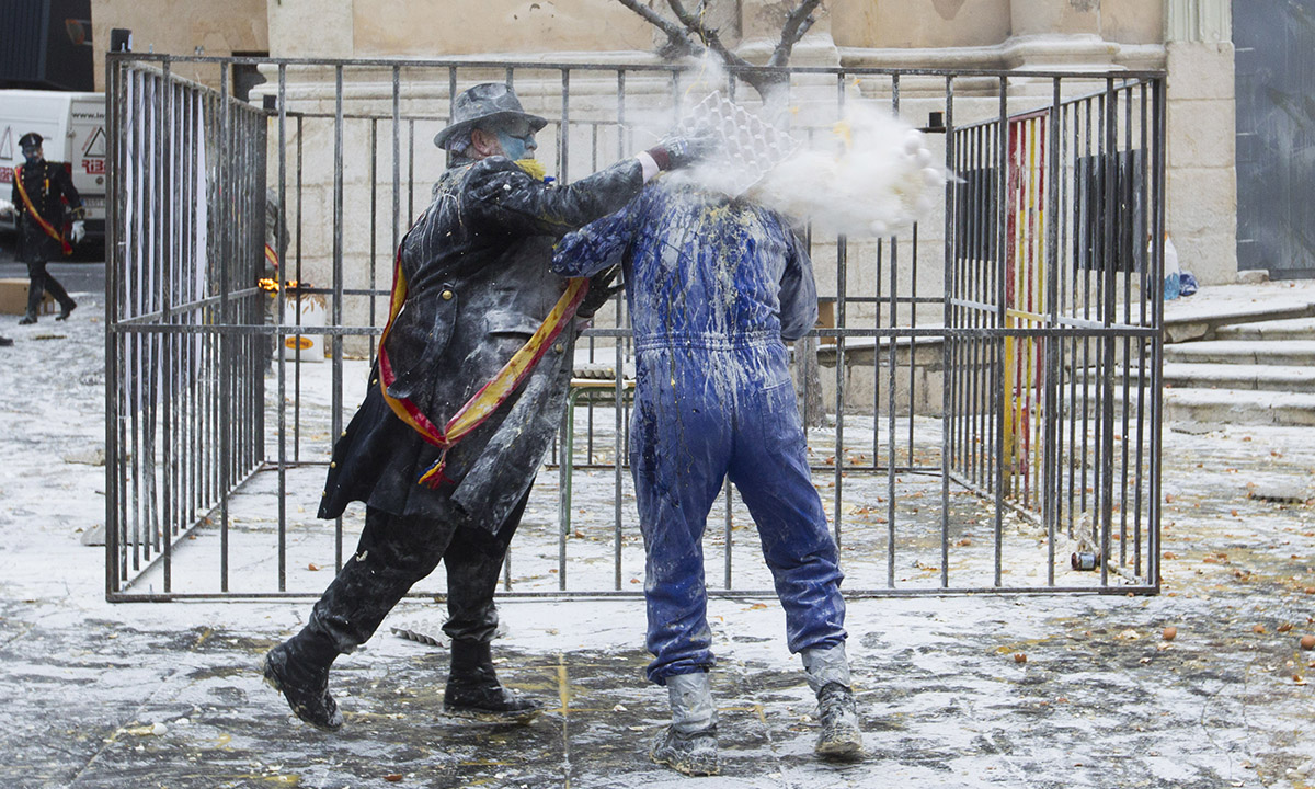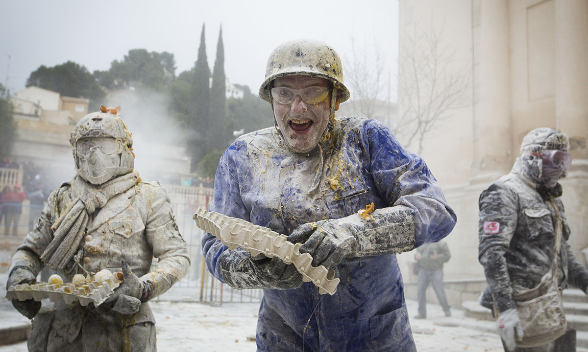 La piazza antistante il municipio di Ibi, comune spagnolo nella comunità autonoma Valenciana, diviene palcoscenico, il 28 dicembre di ogni anno, di una curiosa battaglia a colpi di uova, farina, acqua e petardi.