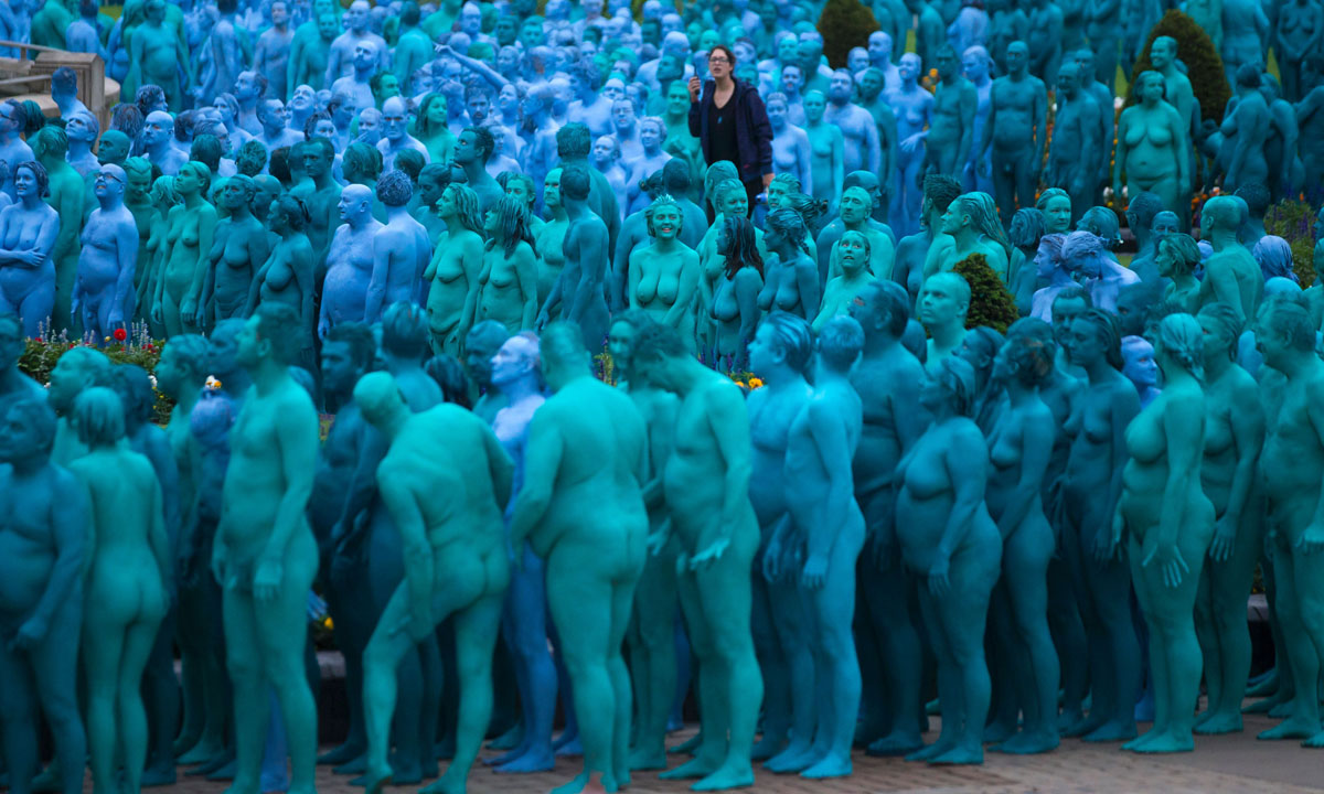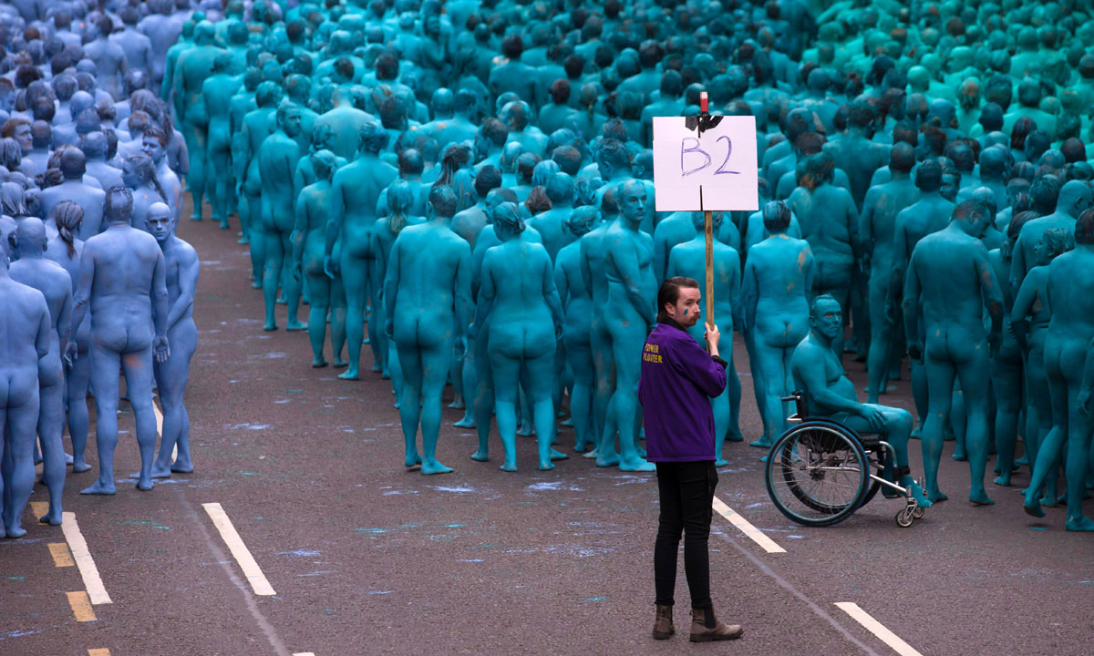 9 luglio 2016. L’artista Spencer Tunick, vestito di nero, dirige gli oltre 3200 volontari che hanno posato nudi, con i corpi coperti di vernice blu, per la sua ultima creazione, intitolata “Il mare di Hull”, a Kingston upon Hull, nel Regno Unito.
