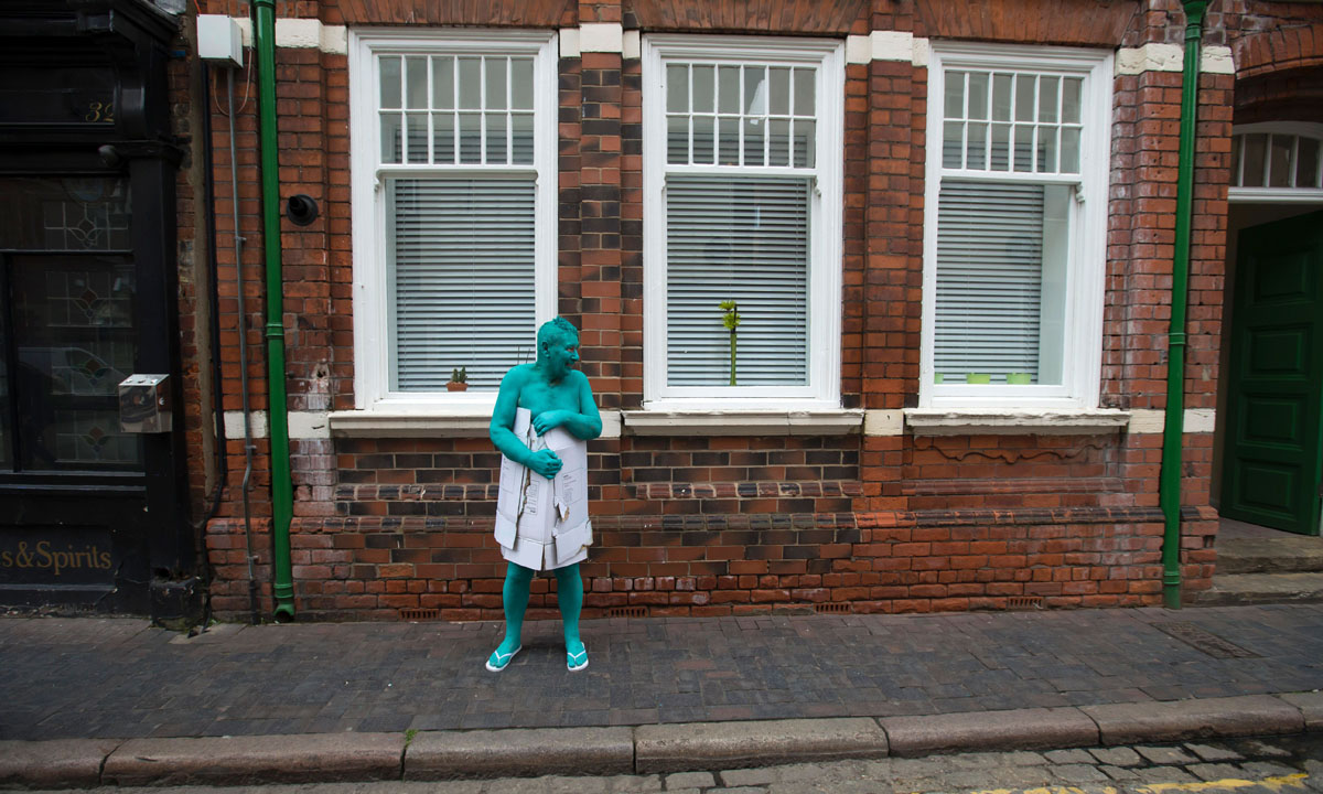 9 luglio 2016. Un uomo fa ritorno a casa dopo aver partecipato, nudo e con il corpo coperto di vernice blu, alla realizzazione dell’ultima creazione dell’artista Spencer Tunick, intitolata “Il mare di Hull”, a Kingston upon Hull, nel Regno Unito.