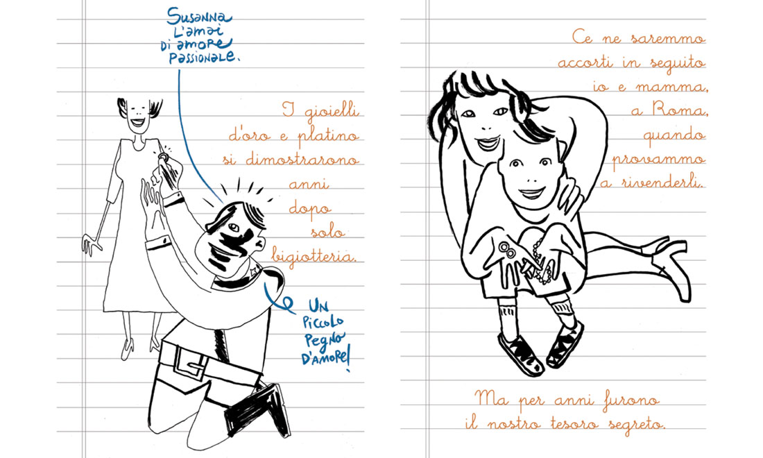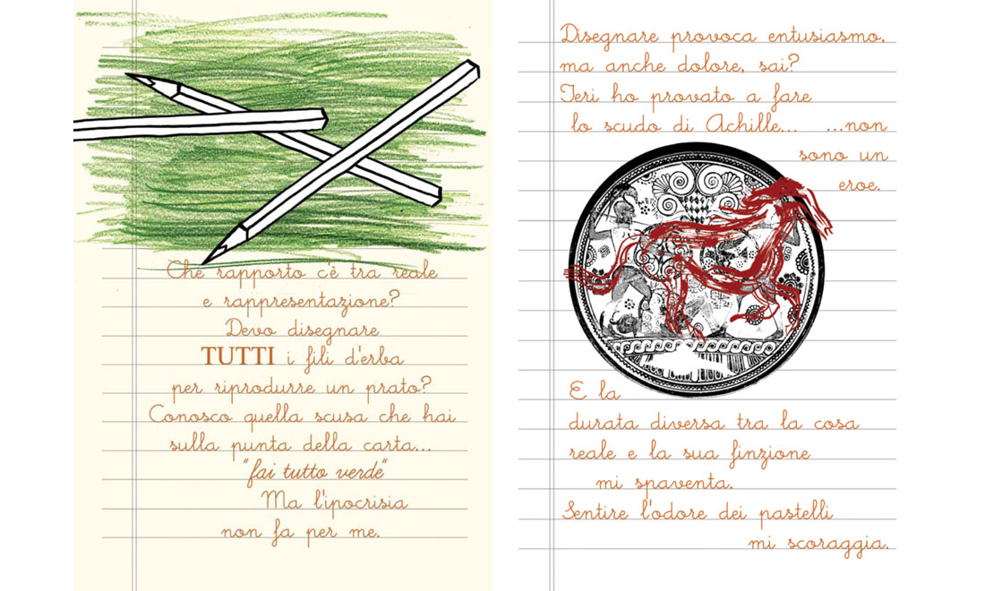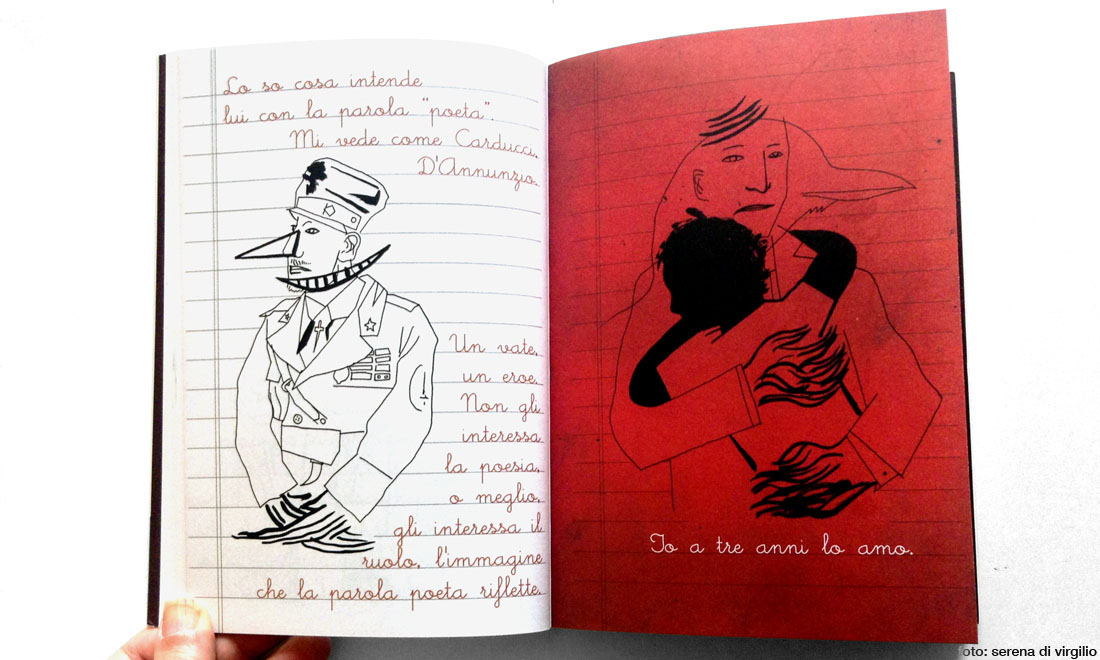 Il formato scelto è inizialmente spiazzante: un misto di immagini e prosa, resa con il font di una calligrafia da scolaretto diligente su pagine di quaderno a righe, che ricorda i libri umoristici per ragazzi della serie “Diario di una schiappa”. Ma la raffinatezza di disegni e rielaborazioni grafiche di foto d’epoca e il tono poetico del testo tolgono subito qualsiasi dubbio sulla tipologia di racconto.