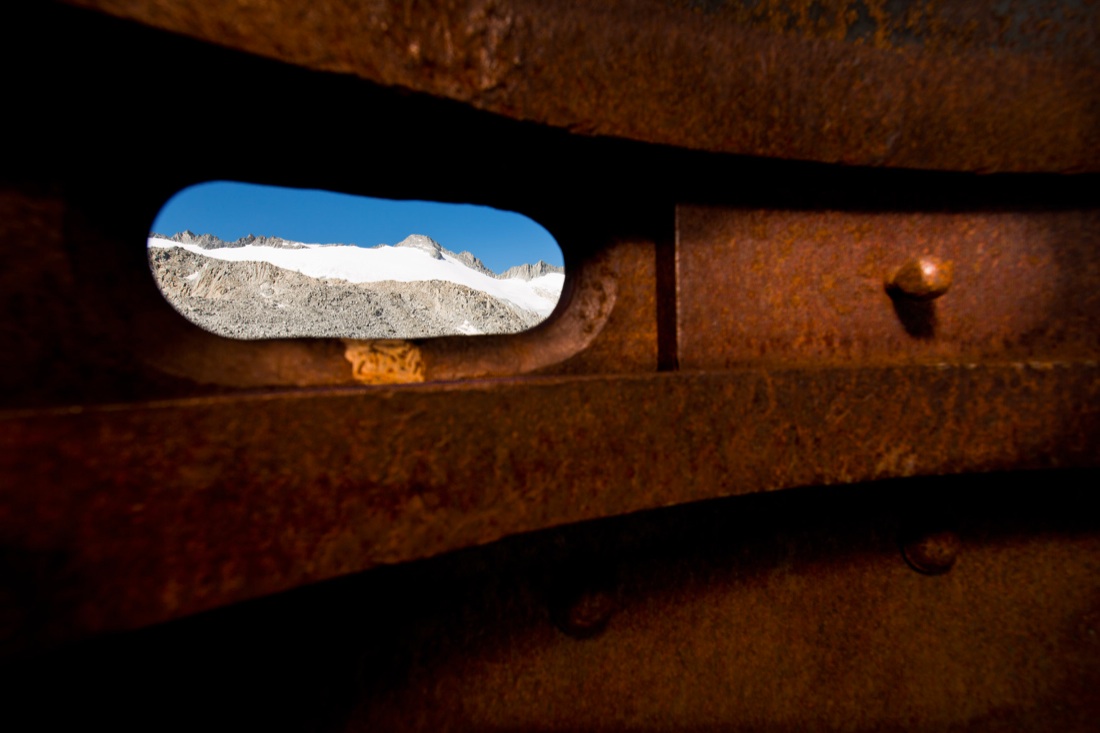 Gruppo Adamello- Pendici di Monte Coel, osservatorio blindato per artiglieria, dalla feritoia vista sul Corno di Cavento