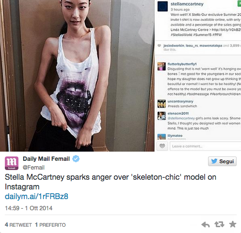 L’indossatrice è, però, scheletrica con un aspetto malsano in odore di anoressia. Alla Rete non è sfuggito e la community del web si è levata come un sol uomo accusando la McCartney di veicolare un’immagine di donna sbagliata, superata e fuorviante. Decine i commenti che con l’hashtag “Unfollow Stella” invitavano a boicottare la maison. “Questo non è saper indossare un vestito ma appendere qualcosa su delle ossa” ha scritto qualcuno e un altro ha aggiunto: “Credevo disegnassi i tuoi abiti pensando a delle vere donne ma questo è davvero troppo, vergognati” per poi attaccare: “È un’immagine atroce e spaventosa perché questa ragazza è chiaramente molto malata e rappresenta tutto ciò che di sbagliato c’è nel mondo della moda”.